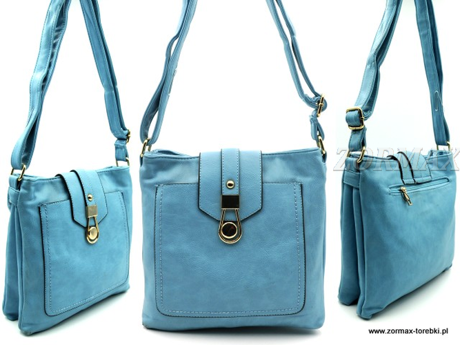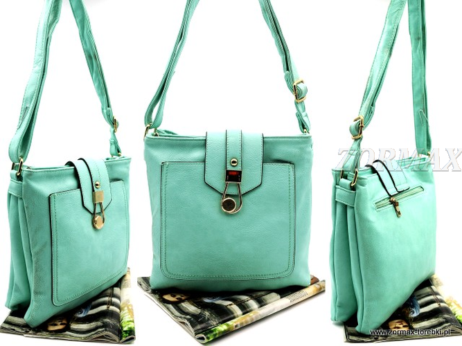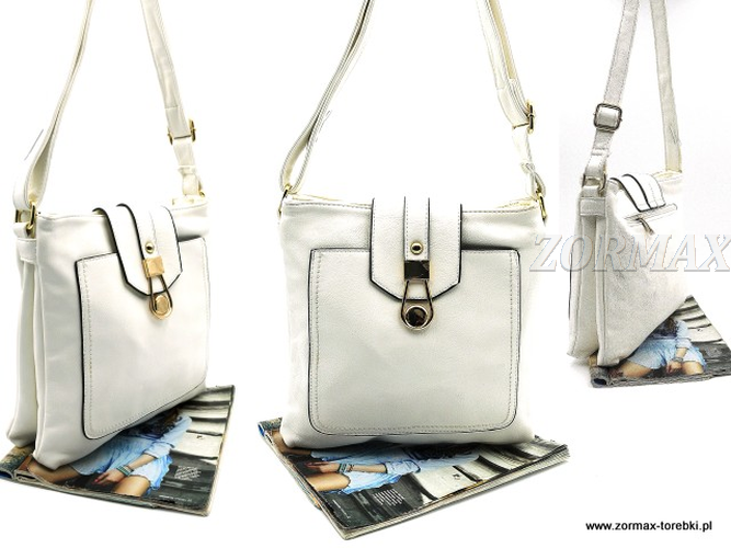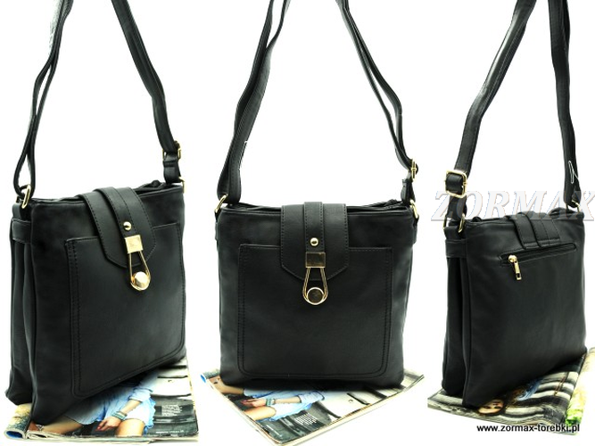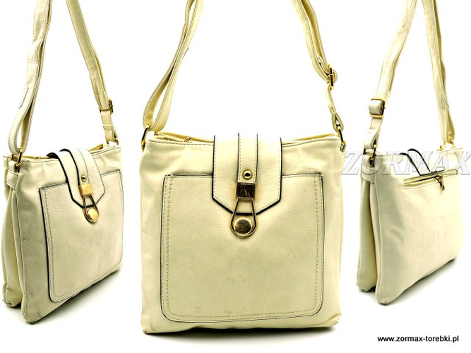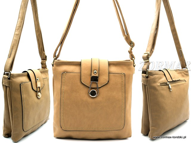Stylowa modna torebka damska, listonoszka przypadnie do gustu modnym kobietom w każdym wieku. Torebka trzykomorowa, z czego dwie boczne komory zapinane na zamki w kolorze stonowanego złota. Ponadto efektowną ozdobą torebki jest złota zawieszka przerzucana z tylnej ścianki na przód, która jednocześnie pełni role zapięcia i w finezyjny sposób otacza złoty duży guziczek, w połączeniu tworząc mega dekoracyjną ozdobę modelu. Z tyłu torebka posiada użytkową kieszeń na drobiazgi.