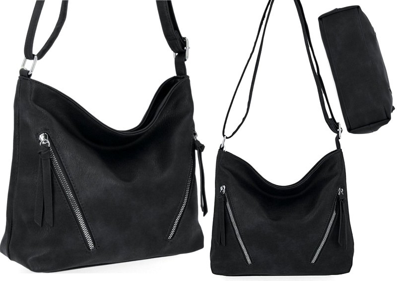 Praktyczna czarna torebka listonoszka z ukośnymi kieszeniami HURT.