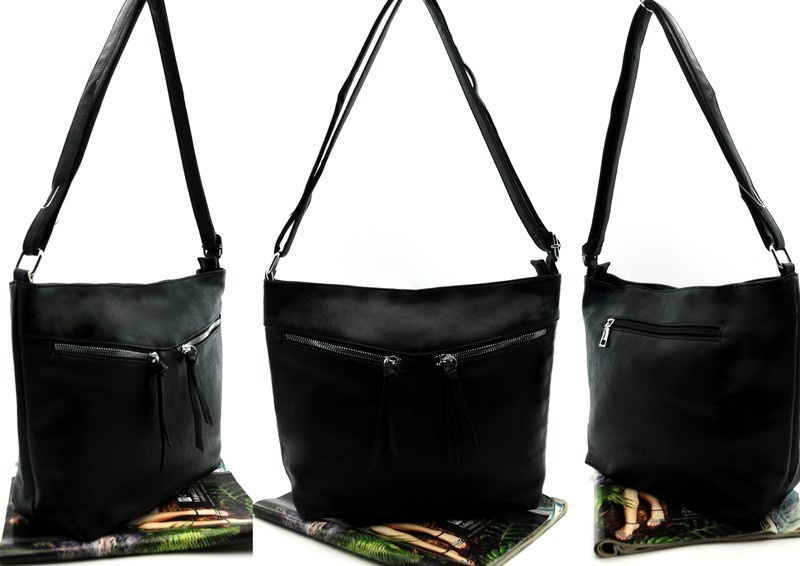 Miękki duży i wygodny model torby damskiej hurt torebki typu listonoszki casual z szerokim wejściem zamykanym na suwak. Torebka wykonana z wysokiej jakości skóry ekologicznej. Dwie użytkowe kieszonki na przedniej ścianie torebki zakończone efektownymi ozdobnymi zamkami i efektownym ściegiem. Doskonały wybór na spacery po mieście jak również na książki do szkoły. Długi regulowany pasek ( max 132 cm ) umożliwia wygodne i komfortowe noszenie torebki przez ramię. Klasyczny model dopasujesz do wielu różnorodnych stylizacji, a dodatkowe 3 kieszeni ( na telefon, na drobiazgi i na suwak ) w środku ułatwią uporządkowanie Twoich rzeczy.
