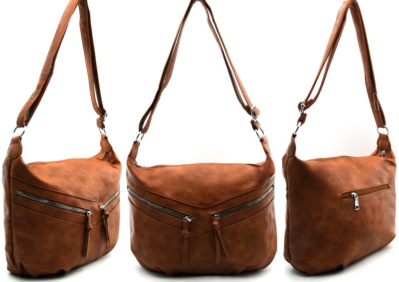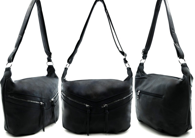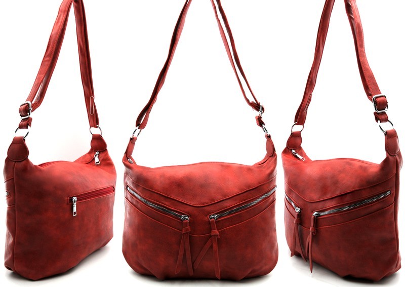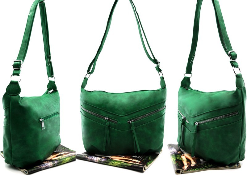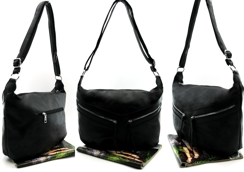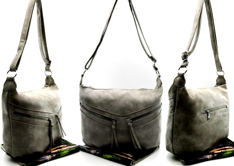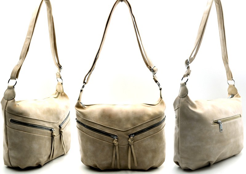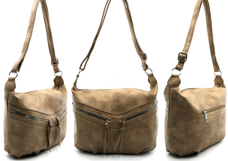 Miękki i wygodny model torby damskiej hurt torebki typu listonoszki casual w formie półksiężyca z szerokim wejściem zamykanym na suwak. Torebka wykonana z wysokiej jakości skóry ekologicznej. Przód torebki zdobią 2 kieszonki zamykane ozdobnymi zamkami z uroczymi wisiorkami . Z tyłu - kieszeń na drobiazgi Doskonały wybór na spacery po mieście jak również na książki do szkoły, wejdzie mięki zeszyt A4. Długi regulowany pasek ( max 135 cm ) umożliwia wygodne i komfortowe noszenie torebki przez ramię. Klasyczny model dopasujesz do wielu różnorodnych stylizacji, a dodatkowe 3 kieszeni ( 1 zwykła kieszonka i 2 na suwak oraz przegródka zamykana na suwak ) w środku ułatwią uporządkowanie Twoich rzeczy.
