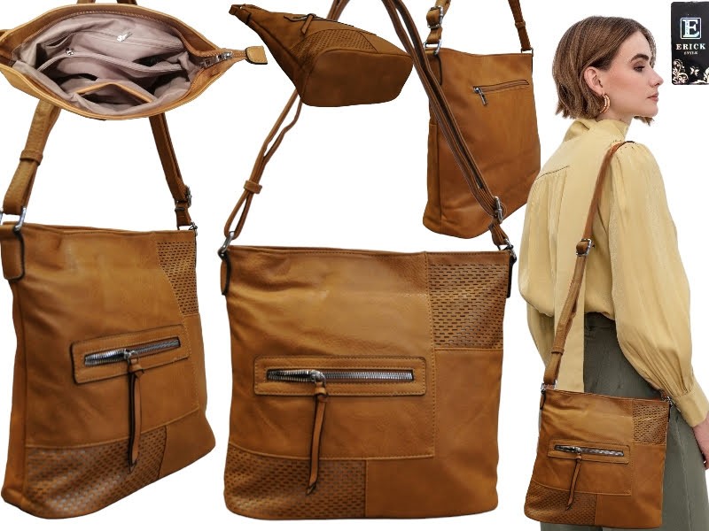 Uzupełnieniem modelu są kieszenie wewnętrzne i zewnętrzne, w tym boczne na różne drobiazgi. Pojemna torba na ramię średniej wielkości i w idealnym kształcie będzie wygodna do pracy biurowej, zamiast plecaka na uczelnię, studia.