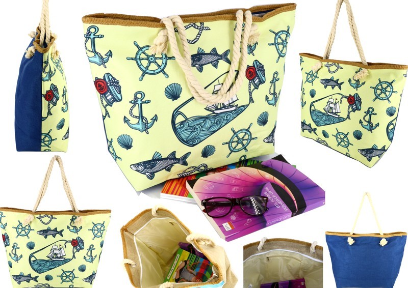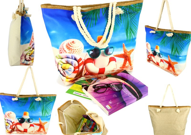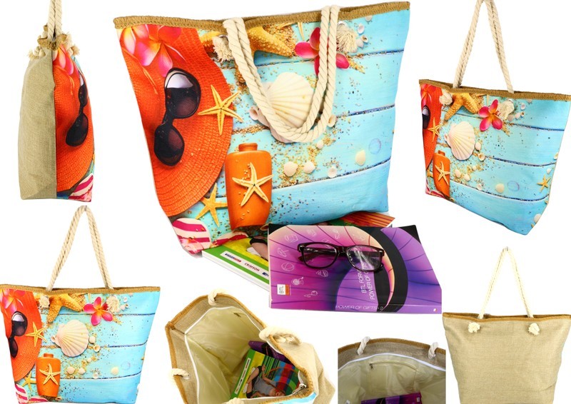Elegancka, lekka torba hurt wykonana z wysokiej jakości materiałów. Wyściełane wnętrze, zapinane na suwak. Szykowne rączki sznurkowe harmonijnie dopełniają całość. Dzięki tak lekkiej i szykownej torbie plażowej bardzo wygodne spacery po plaży czy letnim mieście. Gustowny nadruk nadaje plażowej torbie wyjątkowej oryginalności.