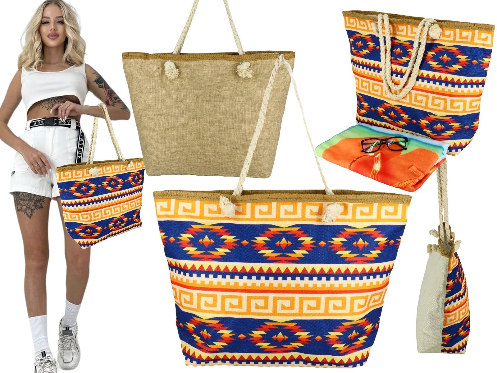 Oszałamiająca torba plażowa w żółto-granatowe azteckie wzory, hurt.