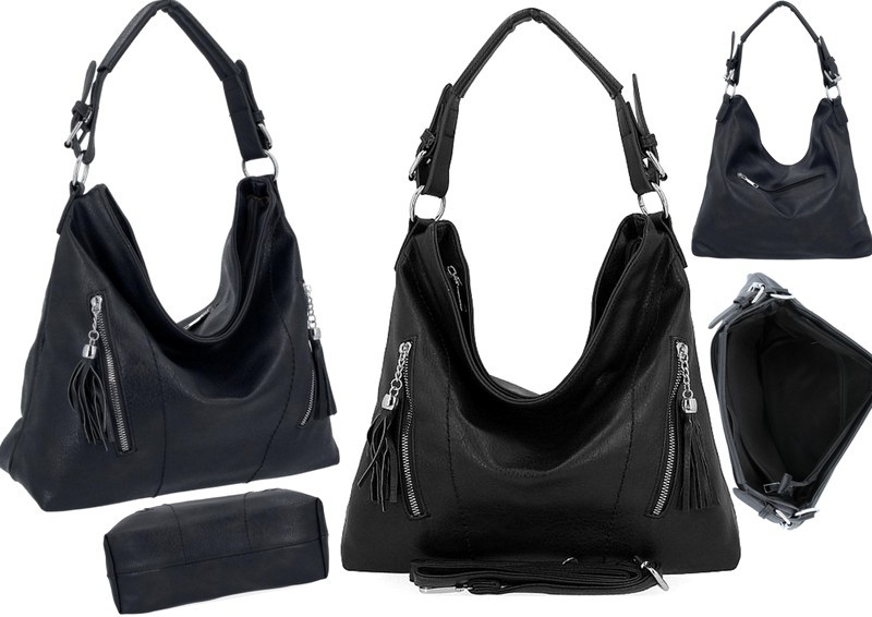 Kobieca czarna POJEMNA torebka worek z frędzelkami HURT