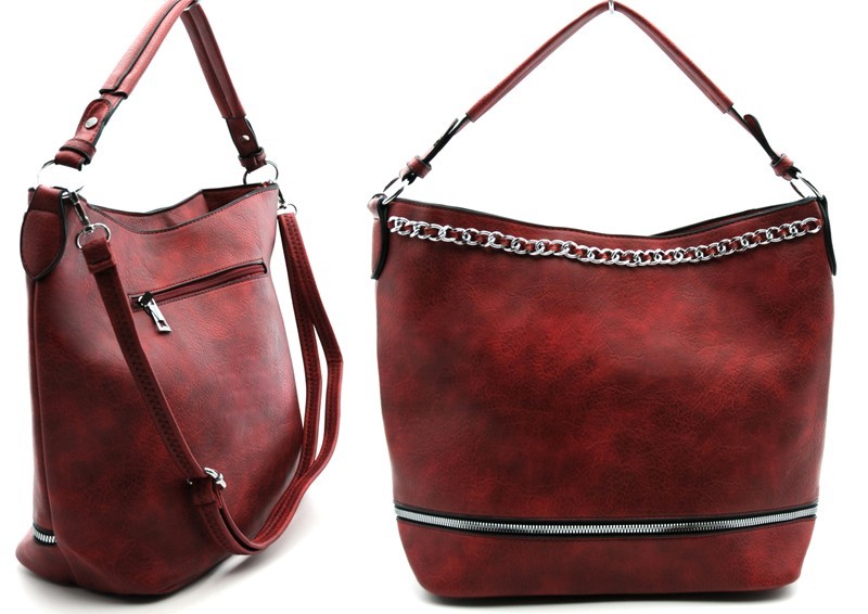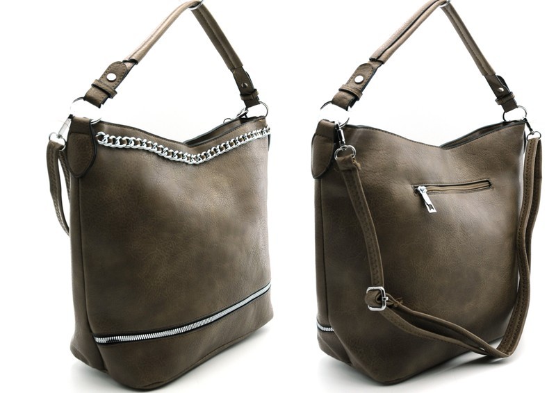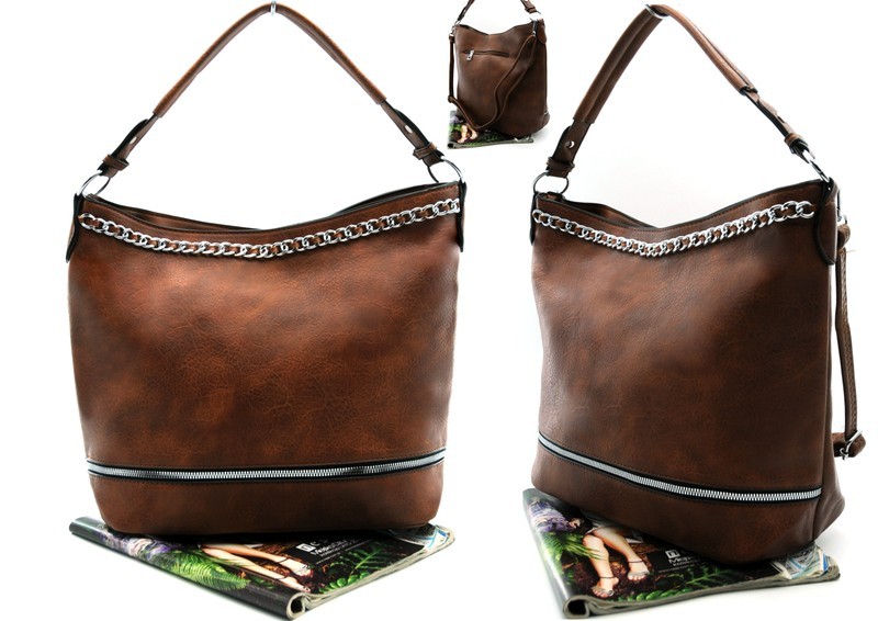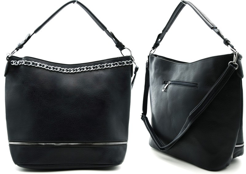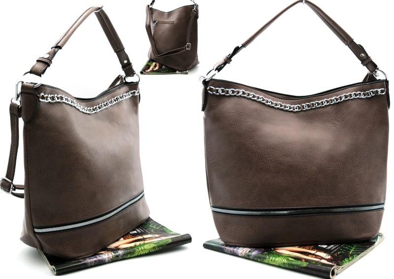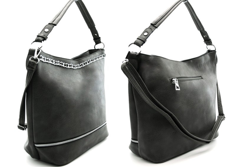 Torebka damska, torba typu worek to efektowny element kolekcji ZORMAX. Oryginalny model torebki wykonany z ekskluzywnej eko skóry i wyróżnia się funkcjonalnym designem: w wersji kompaktowej to modna torebka na ramię, która może służyć również jak pojemną torbą na zakupy, idealną na biurowe dokumenty i akta. Model jest ozdobiony ozdobnym zamkiem, które zapewniają wyjątkowy efekt wolumetryczny. Wewnętrzna kieszeń na suwak dopełnia funkcjonalnego projektu. Stylowa, pojemna torebka uzupełniona wdzięcznym, regulowanym paskiem, który pozwala nosić torbę na ramieniu lub w ręku. Charakterystycznym elementem projektu tej torebki jest przyciągający wzrok metalowy łańcuszek w kolorze srebra.