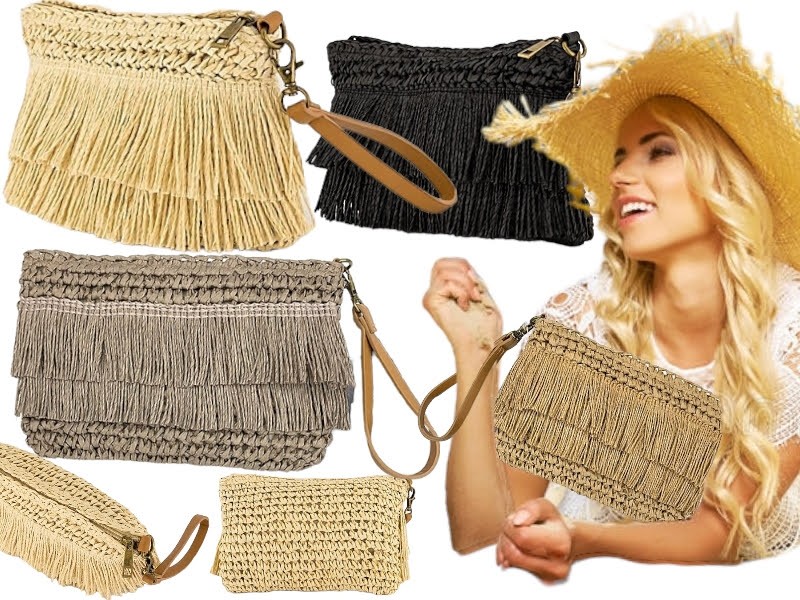 słomkowe frędzle, jest jak złoto lśnią na słońcu, przyciągając ciekawskie spojrzenia. Do kopertówki dołączona odpinana rączka z eko skóry, aby można była wygodnie założyć torebkę na nadgarstek. Ponadto kopertówka wewnątrz zastała wykończona bawełnianą poszewką i posiada wewnętrzną kieszonkę.