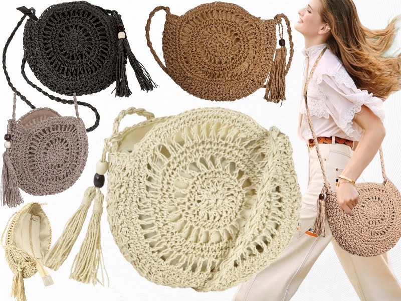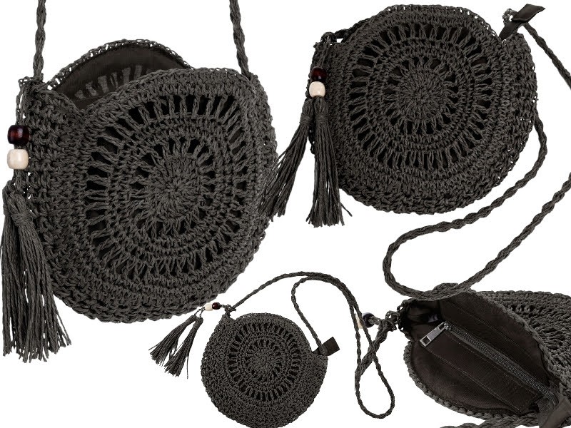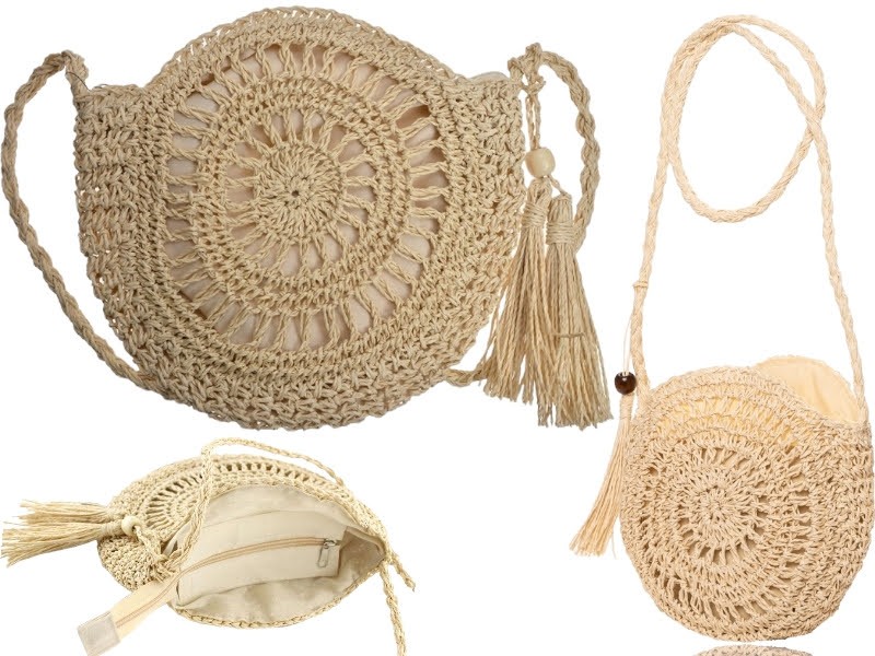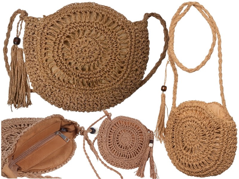 Okrągła torebka listonoszka w stylu BOHO pleciona techniką makramy to, bez wątpienia, trend sezonu letniego. Letnia listonoszka - niezastąpiona opcja na wakacje i spacery, pomieści niezbędne drobiazgi - telefon, karty, lusterko i grzebień. Wewnątrz znajduje się bawełniana podszewka i otwarta kieszonka, torebka zamykana na suwak. Torebka jest bardzo lekka i ponadto nie zajmuje dużo miejsca w walizce. Okrągła wiklinowa torebka wykonana z 100% paper idealnie wpasowuje się w zrelaksowany, letni styl. Piękna torebka z naturalnego materiału z frędzlami nadaje się na wakacje, spacery po mieście, Pasek można skrócić niedbale zawiązując supeł na odpowiedniej długości.