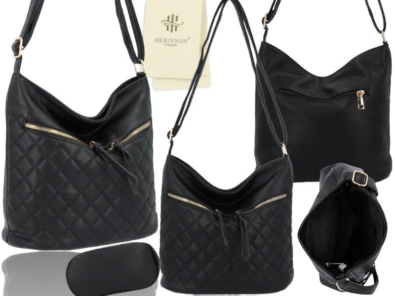 Czarująca czarna pikowana torebka cross-body z ukośnymi zamkami hurt.
