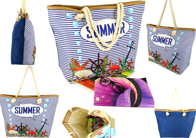 Elegancka, lekka torba hurt wykonana z wysokiej jakości materiałów. Wyściełane wnętrze, zapinane na suwak. Szykowne rączki sznurkowe harmonijnie dopełniają całość. Dzięki tak lekkiej i szykownej torbie plażowej bardzo wygodne spacery po plaży czy letnim mieście. Gustowny nadruk nadaje plażowej torbie wyjątkowej oryginalności.
