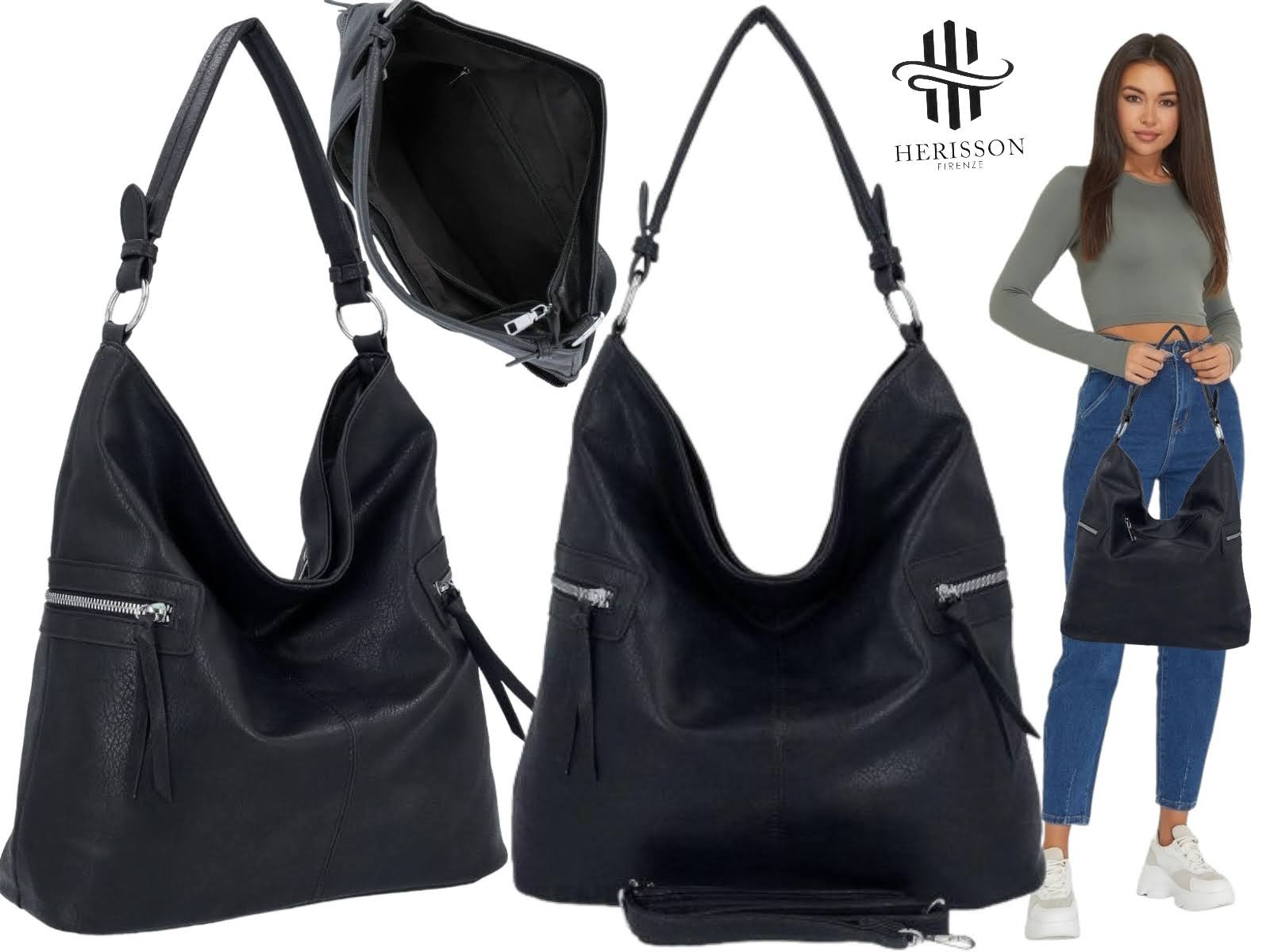 Szykowna CZARNA uniwersalna torebka worek z bocznymi kieszeniami, hurt.
