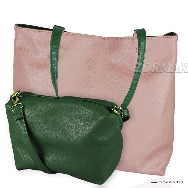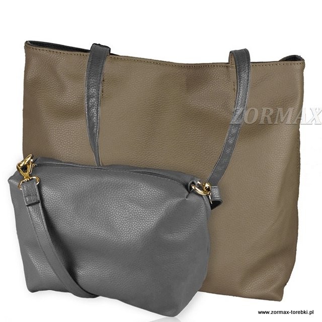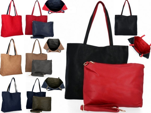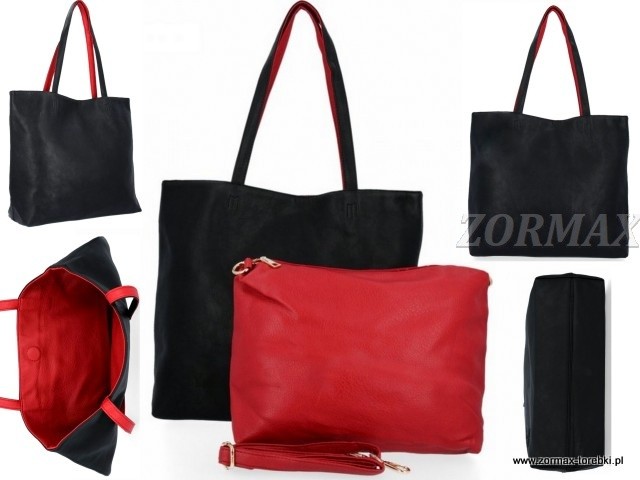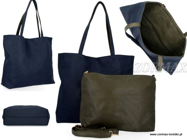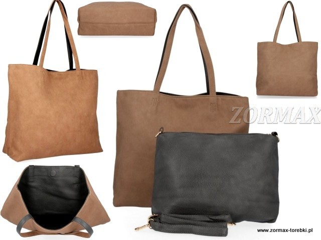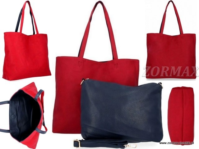Torebka hurt -shopper 3 w 1 .Dwukolorowa ,-po odwróceniu na lewą strone mamy inny kolor .Zapinana na zatrzask magnetyczny. Do torebki dołączony dopinany pasek.Mieści format A4.