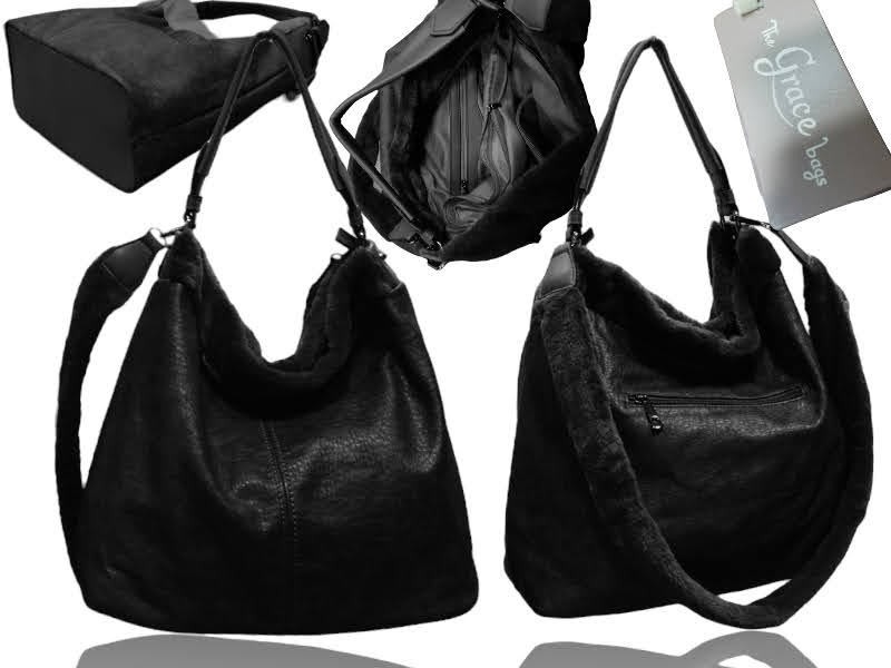 Nadzwyczaj oryginalny, a zarazem bardzo praktyczny model torebki damskiej w formie pojemnego worku włoskiej marki "The Grace Bags. Podążając za najmodniejszymi trendami mody torebka została obszyta oryginalnym eko futrzanym kołnierzem, wszakże miłym w dotyku. Ponadto torebka posiada także eko futrzany pasek.